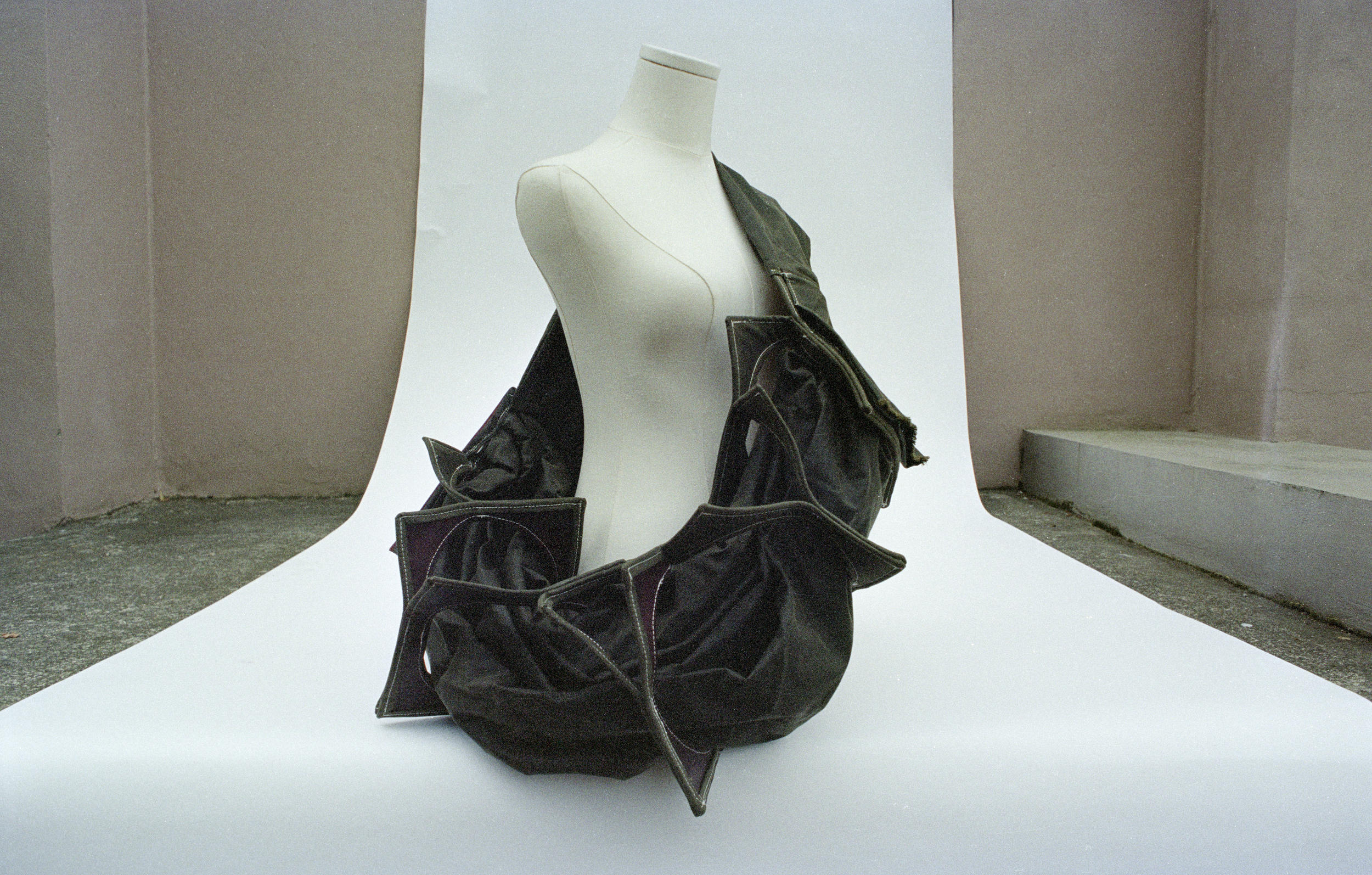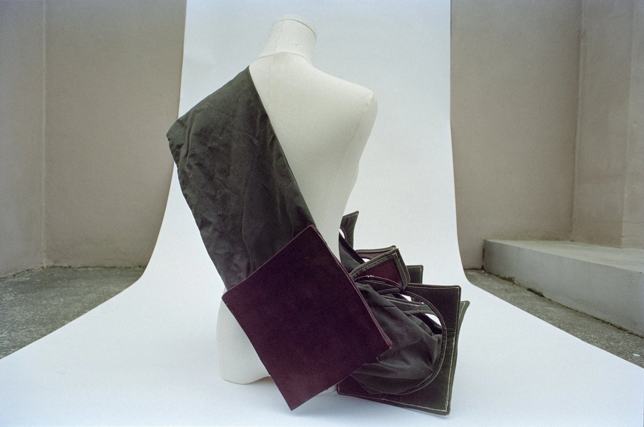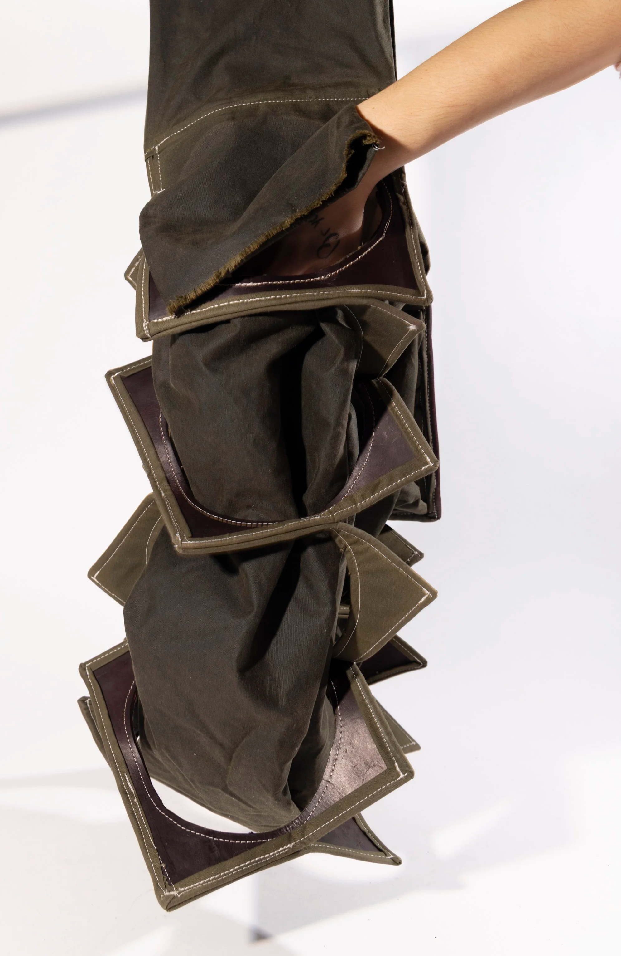 Latent Volume examines form as something activated through wear. Composed of a circular core defined by curved lines and restrained by a rigid, linear structure, the piece shifts depending on how it is held. Designed to be worn in two ways, the bag reveals either its circular or rectangular form through movement and human interaction.
