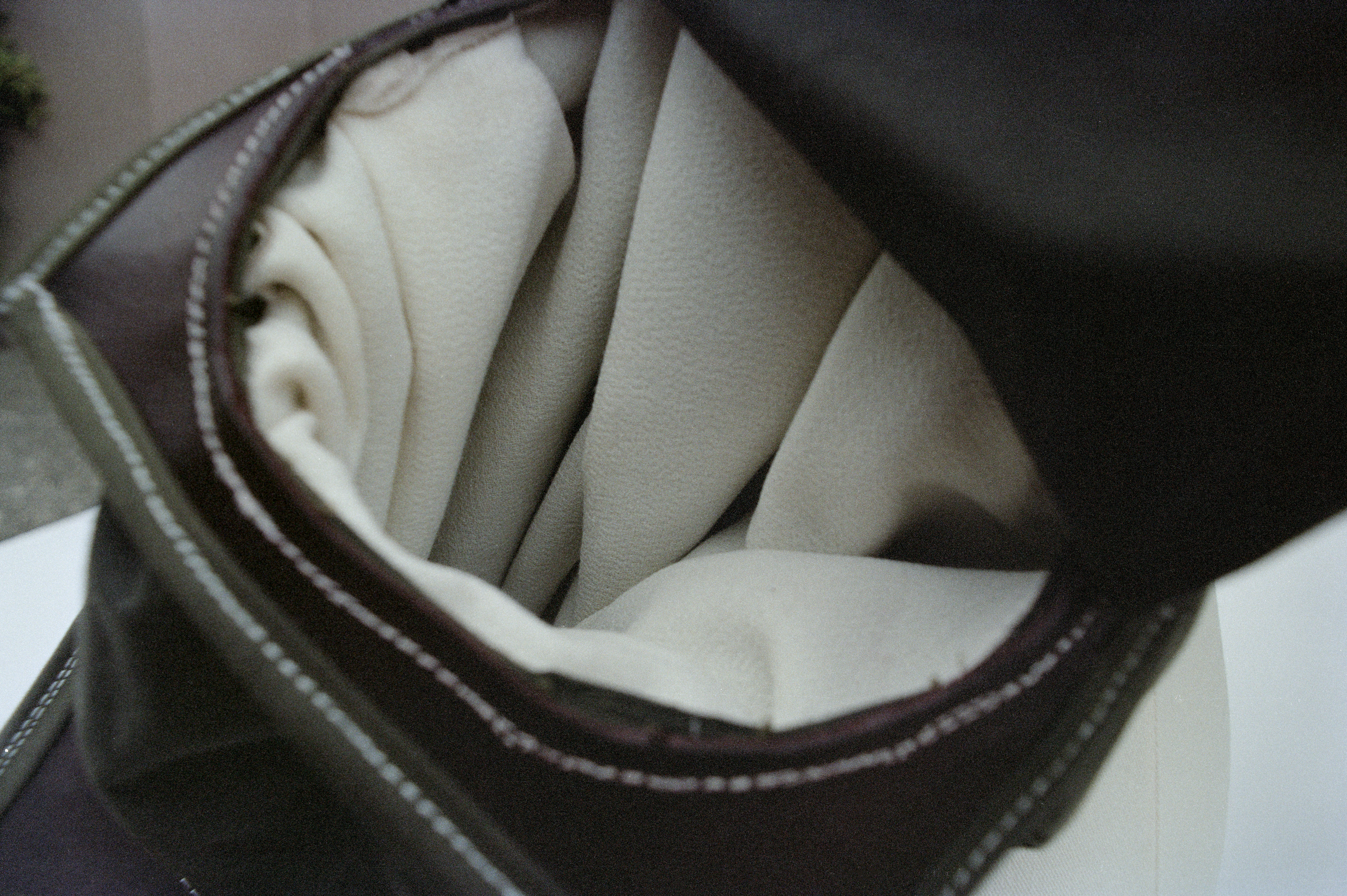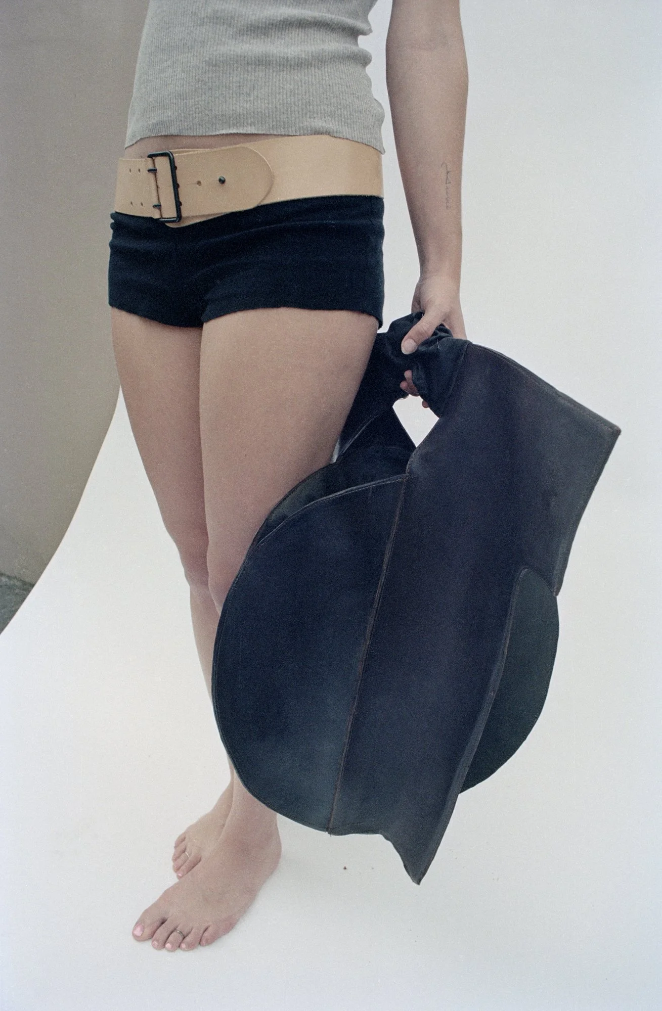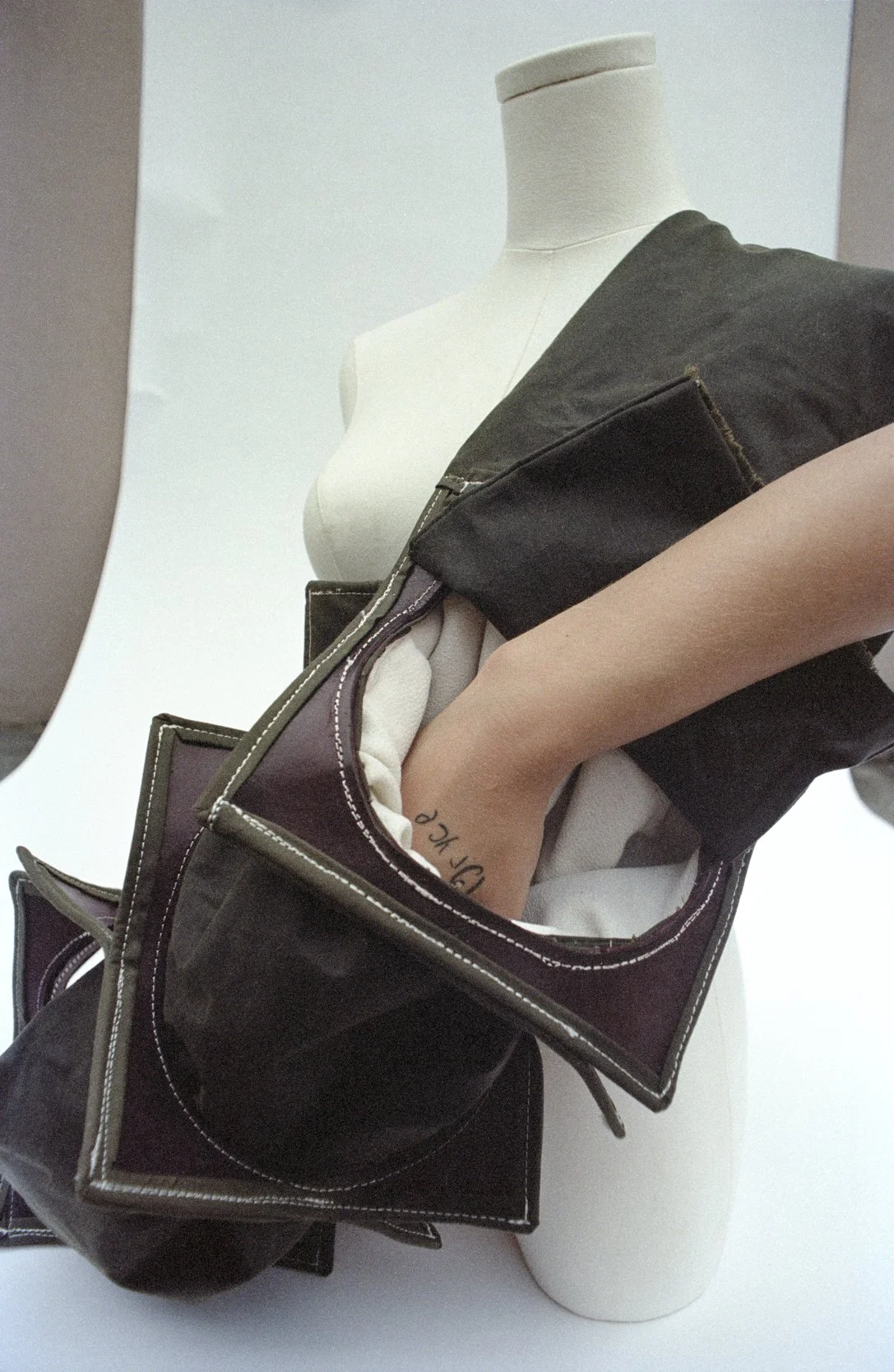 Latent Volume examines form as something activated through wear. Composed of a circular core defined by curved lines and restrained by a rigid, linear structure, the piece shifts depending on how it is held. Designed to be worn in two ways, the bag reveals either its circular or rectangular form through movement and human interaction.