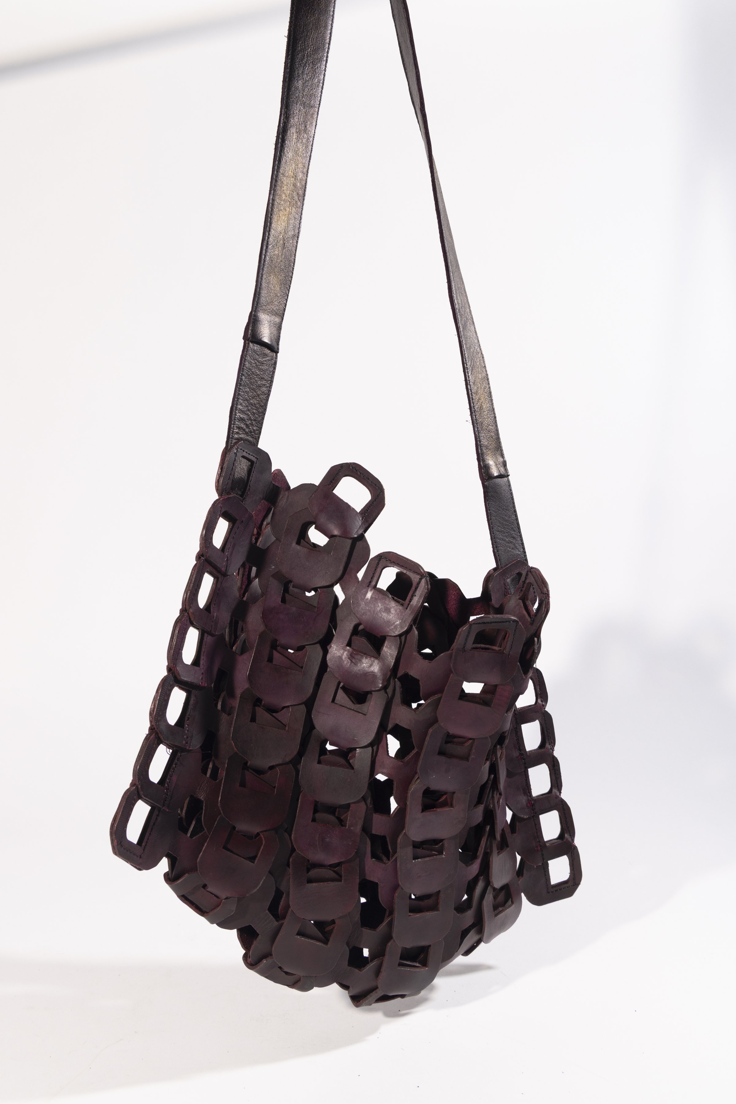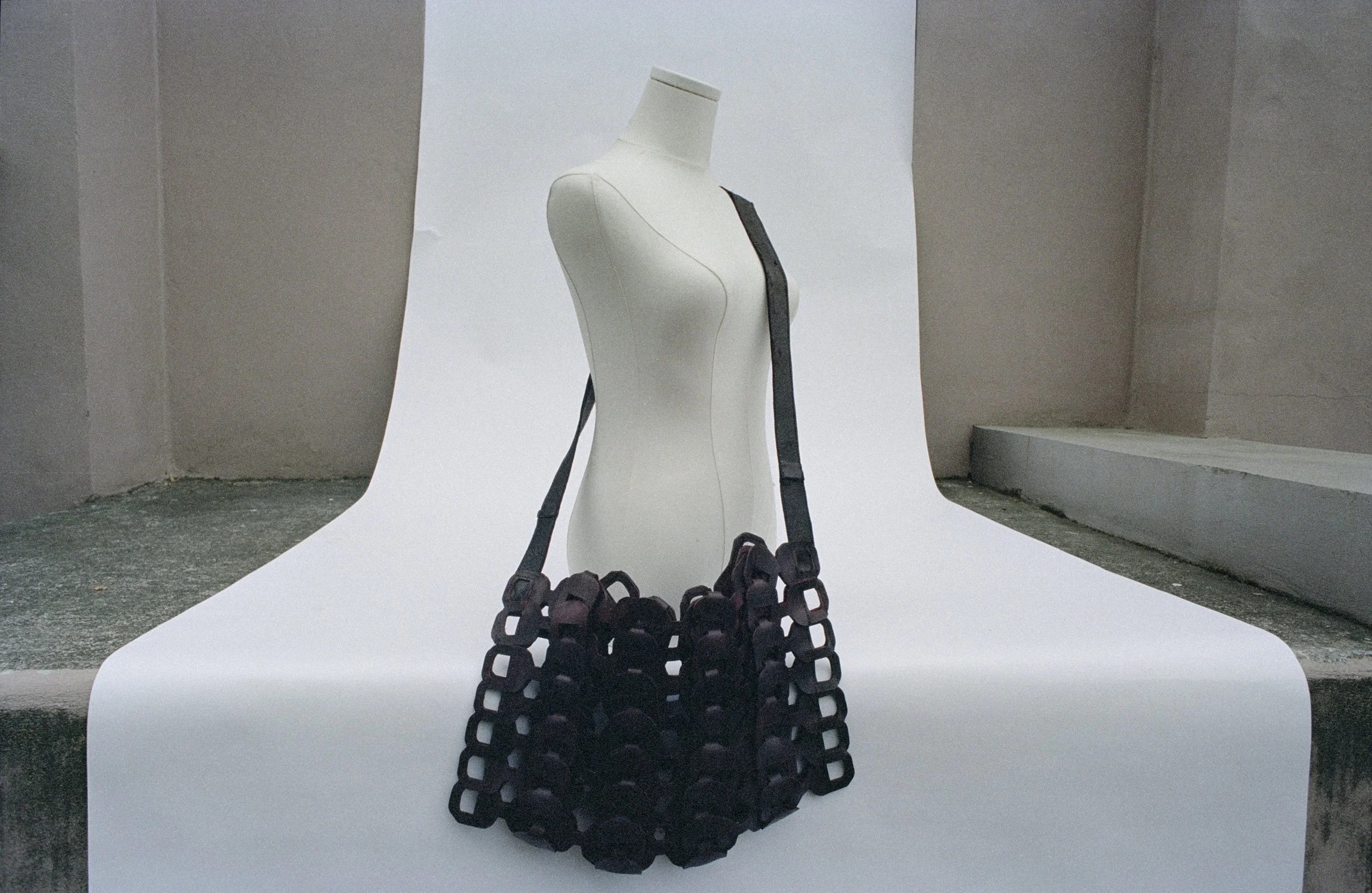 This piece explores precision and repetition through laser-cut construction. A chain-link structure is formed from digitally calibrated components, assembled with minimal stitching, allowing the structure itself to define elegance and form